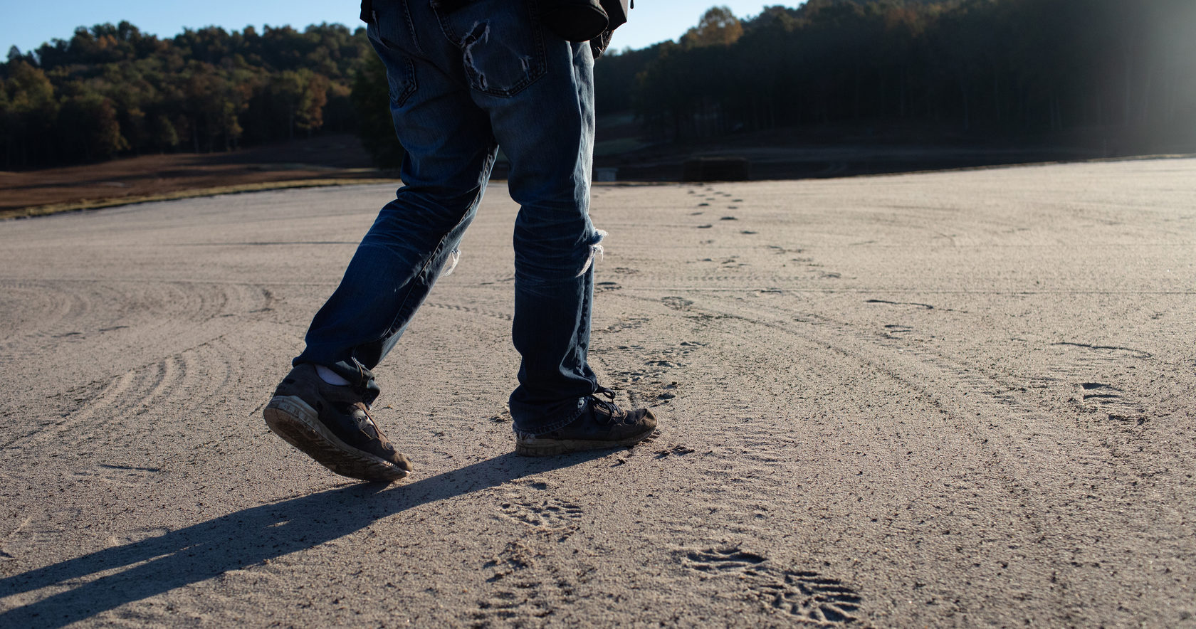 ^Broekema walks across one of the bunkers on the golf course he is doing a freelance project on.
