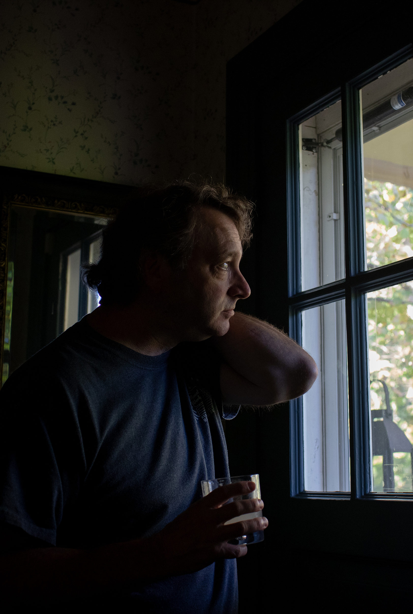 Tim Broekema looks out his back porch door at his garden while drinking his lemon juice his wife makes for his every morning.